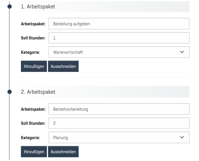 Arbeitspakete können an einer beliebigen Stelle zwischen bestehenden Arbeitspaketen eingefügt werden. Dafür ist der Button „Hinzufügen“ an der gewünschten Position zu betätigen. Im Anschluss erfolgt die Eingabe des neuen Arbeitspakets wie gewohnt.